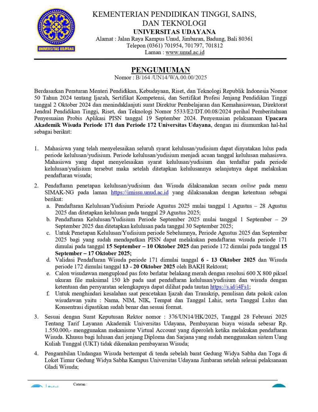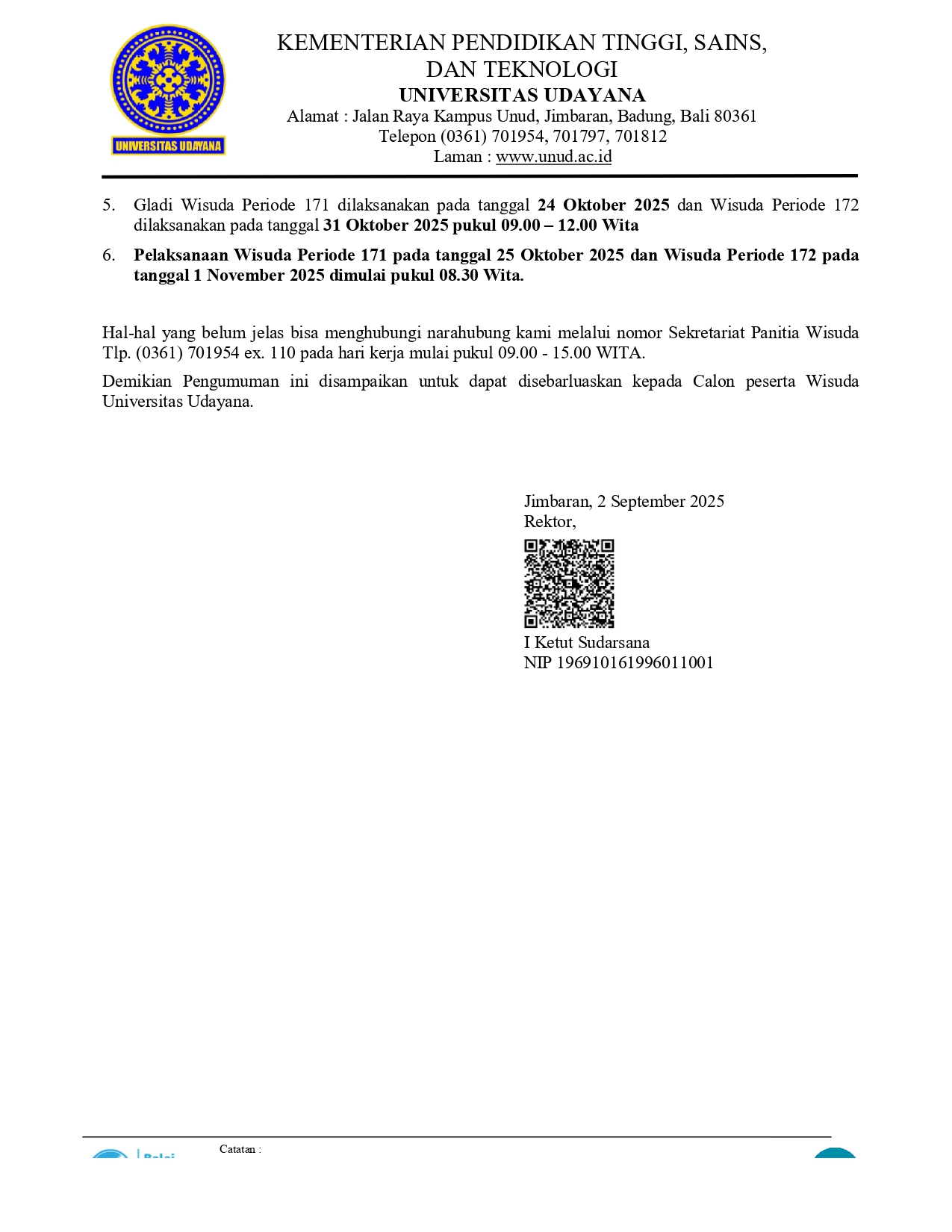 Announcement of Academic Graduation Ceremony for Period 171 and Period 172 of Udayana University